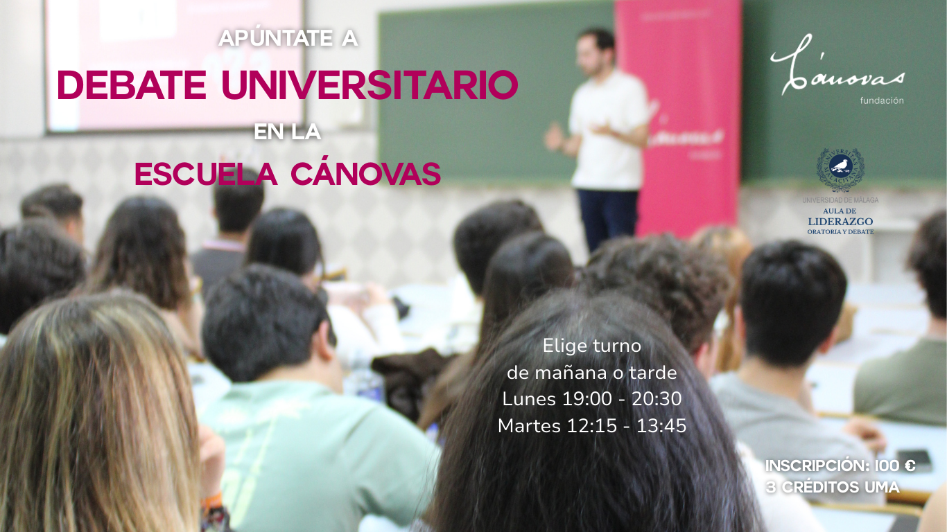 Ya está abierto el plazo de inscripción para el Programa de Debate Universitario de la Escuela Cánovas. Desde hoy y hasta el lunes 6 de octubre es posible apuntarse a esta experiencia única, cuyas clases se impartirán en dos turnos (lunes por la tarde o martes por la mañana) en la Facultad de Derecho de la Universidad de Málaga. Ofrecemos tres niveles de formación y, como cada año, la UMA otorga a esta actividad un reconocimiento lectivo de 3 créditos, a través del Aula de Liderazgo, Oratoria y Debate. Toda la información aquí .