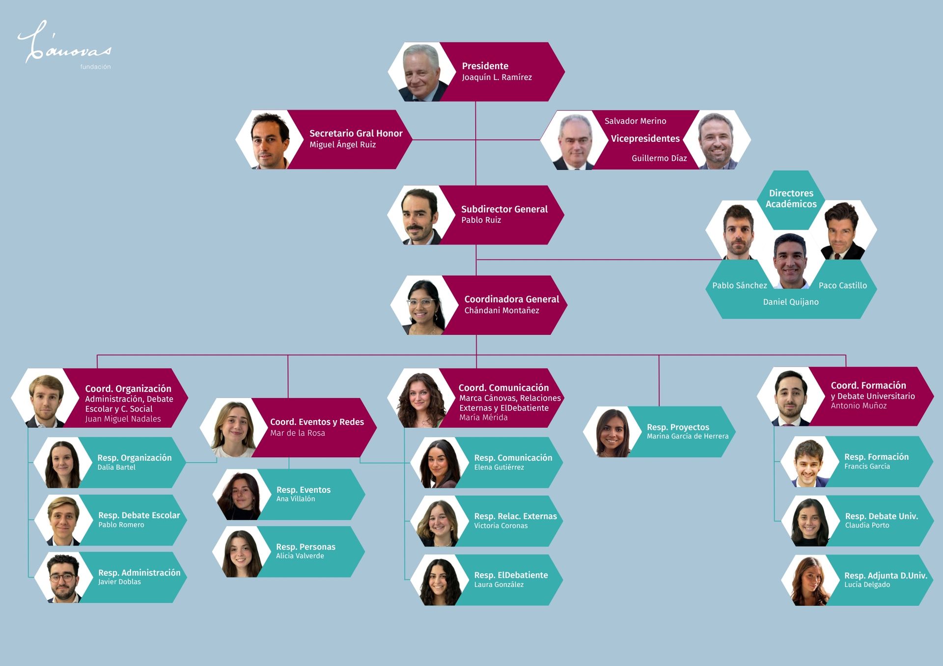 Chándani Montañez se mantiene como Coordinadora General de las que ahora serán las tres áreas estratégicas de la Fundación, que asumen Juan Miguel Nadales, como Coordinador de Organización, Administración, Debate Escolar y Cánovas Social; María Mérida, como Coordinadora de Comunicación, Marca Cánovas, Relaciones Externas y ElDebatiente, y Antonio Muñoz, Coordinador de Formación y Debate Universitario, así como también una Coordinación de Eventos y Redes, que asume Mar de la Rosa. De estas tres áreas estratégicas parten once departamentos diferentes, cuya dirección recae sobre cada uno de los Responsables asignados.