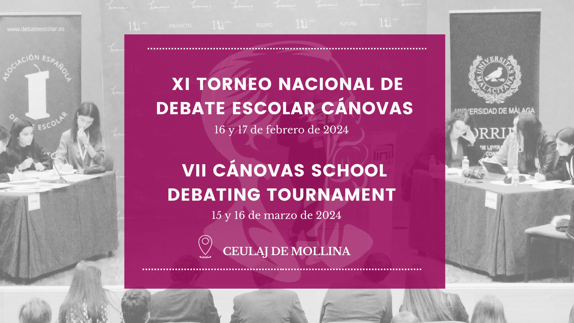 El XI Torneo Nacional de Debate Escolar Cánovas se celebrará, en español, los días 16 y 17 de febrero, mientras que el VII Cánovas School Debating Tournament tendrá lugar, en inglés, los días 15 y 16 de marzo, ambos en el CEULAJ de Mollina (Málaga), como es habitual. Serán casi 400 alumnos de ESO y Bachillerato de toda España los que participen en estos dos torneos, cuyos finalistas se clasificarán para la Fase Final de la Liga Nacional de Debate Escolar, que está prevista para el mes de abril en el Senado.