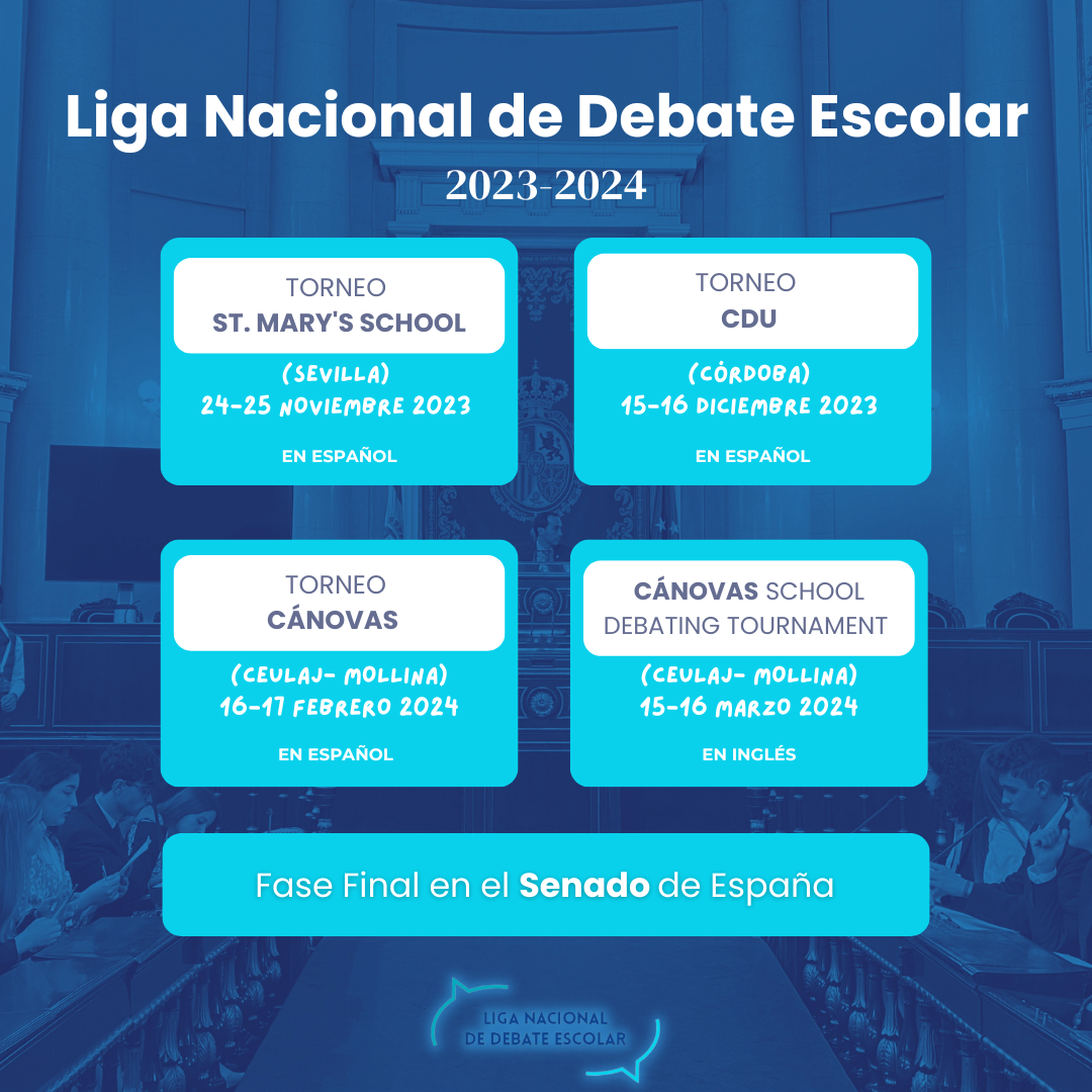 Los torneos que se celebrarán durante este curso 2023/24 son: St. Mary’s School (Sevilla, 24-25 de noviembre), CDU (Córdoba, 15-16 de diciembre), Cánovas (Mollina, 16-17 de febrero) y Cánovas en inglés (Mollina, 15-16 de marzo), además de la Fase Final (Senado, 22 de abril), para la que se clasificarán los ocho finalistas de los citados torneos.