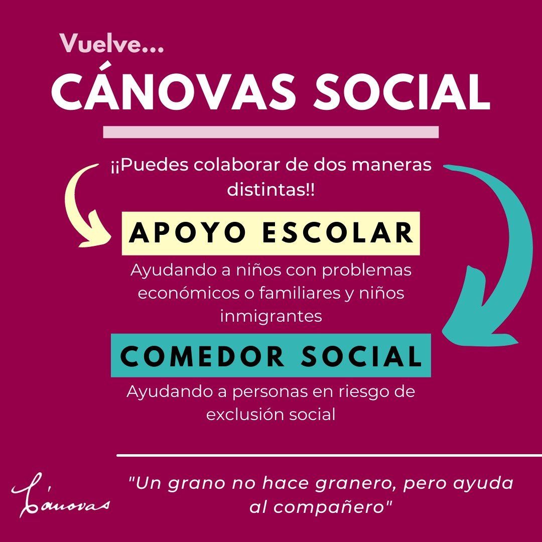 Como una invitación a comprometerse con los más desfavorecidos, Cánovas Social surge como proyecto de voluntariado de la Fundación, que durante este curso colaborará en tres programas: ayuda en comedores sociales, apoyo escolar y recogida de alimentos. Una treintena de jóvenes participa semanalmente en ellos. Si lo deseas, puedes apuntarte en este enlace.