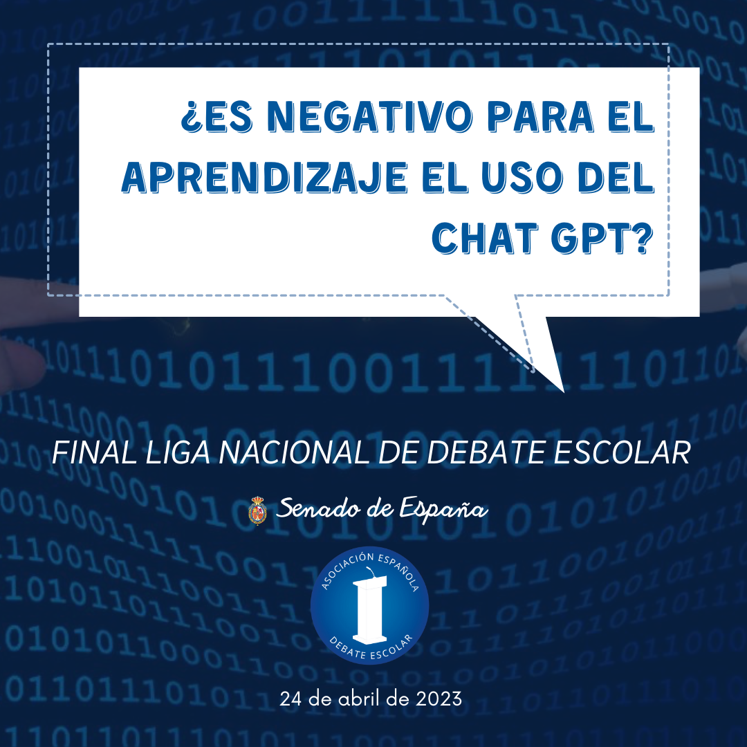 El Senado acogerá el próximo lunes 24 de abril la Fase Final de la Liga Nacional de Debate Escolar, en la que participan los 8 mejores equipos que han debatido en los distintos torneos nacionales celebrados durante el curso (St Mary's School, Cánovas, CDU y Cánovas en inglés). En esta ocasión, el tema a debatir será si es negativo para el aprendizaje el uso del Chat GPT, un modelo de lenguaje basado en la inteligencia artificial cuyo uso en contextos de aprendizaje está siendo ampliamente debatido en estos momentos en la comunidad educativa. Puede consultarse tanto la carta explicativa
